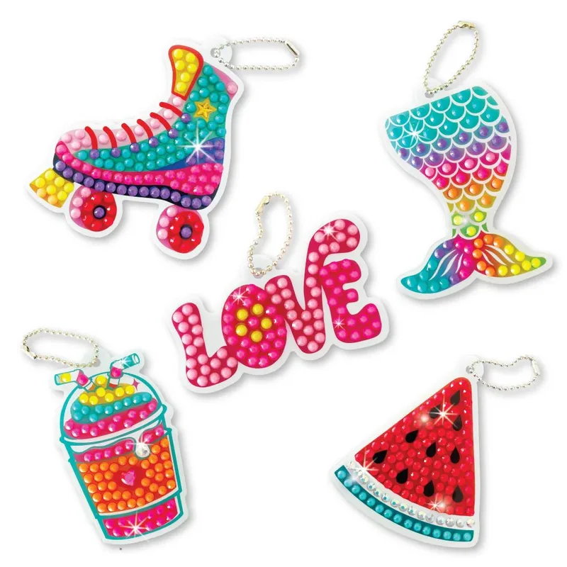 הילדים עובדים שלב־שלב, משבצים יהלומים קטנטנים, מוסיפים שרשרת – ויוצרים 5 קישוטים מרהיבים לתיק או למפתחות.