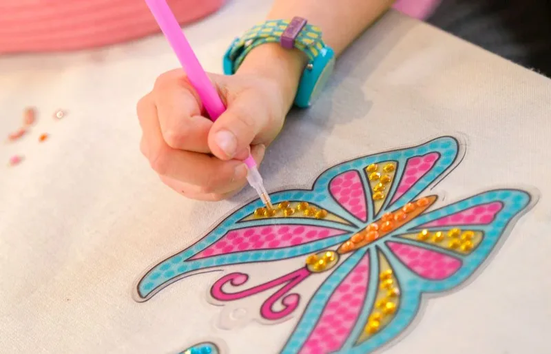 הילדים משבצים אבני חן צבעוניות על גבי לוחות שקופים בעיצובים מתוקים (פרפר, אייל וסנאי), בעבודה רגועה ומדויקת.
