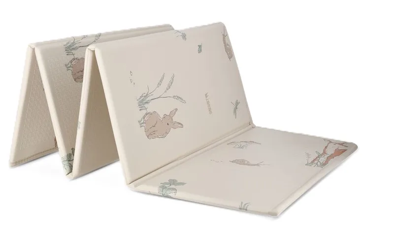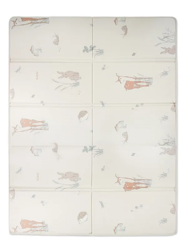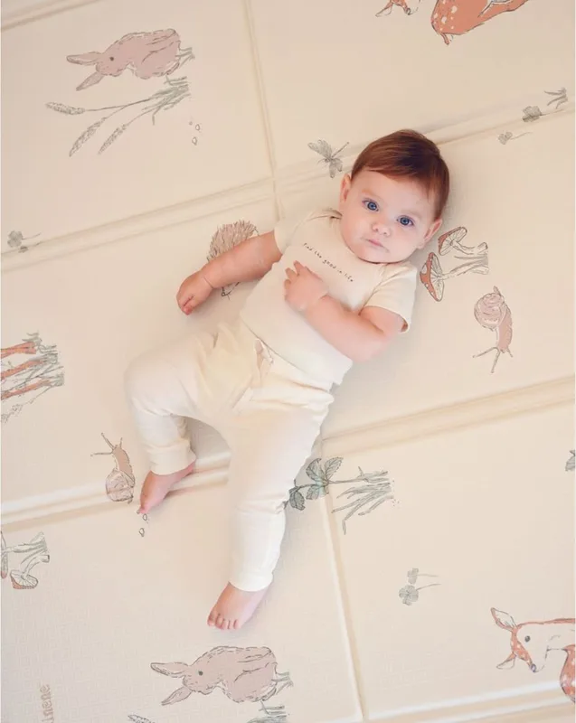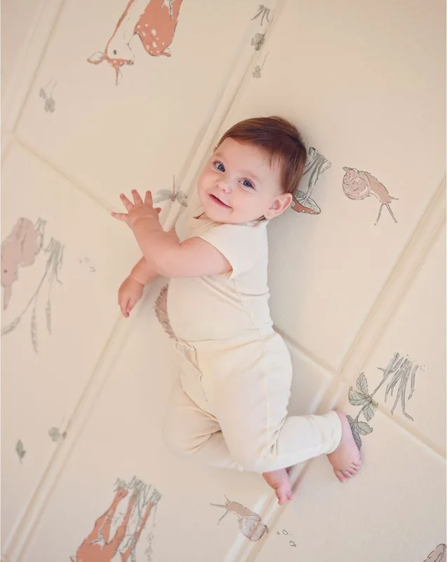 משטח הפעילות המתקפל מבית Minene בגוון אבן יוצר אזור מוגן, מרופד ואסתטי – כזה שמתאים לתינוק, אבל גם משתלב בצורה טבעית בבית.