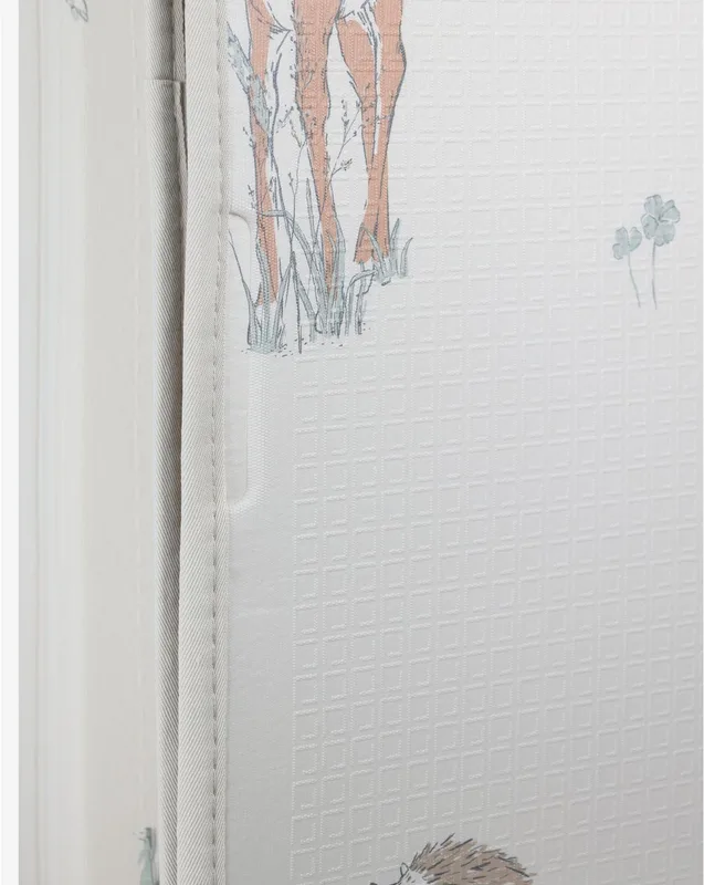 דו־צדדי: צד אחד עם איורי יער עדינים ומלמדים, צד שני עם הדפס עלעלים רגוע המשתלב בעיצוב הבית.
