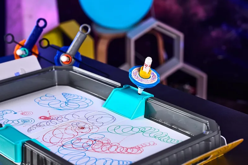 הערכה מאפשרת ליצור ספירלות צבע מרהיבות באמצעות סביבונים מיוחדים שמסתובבים בתוך זירה ייעודית.