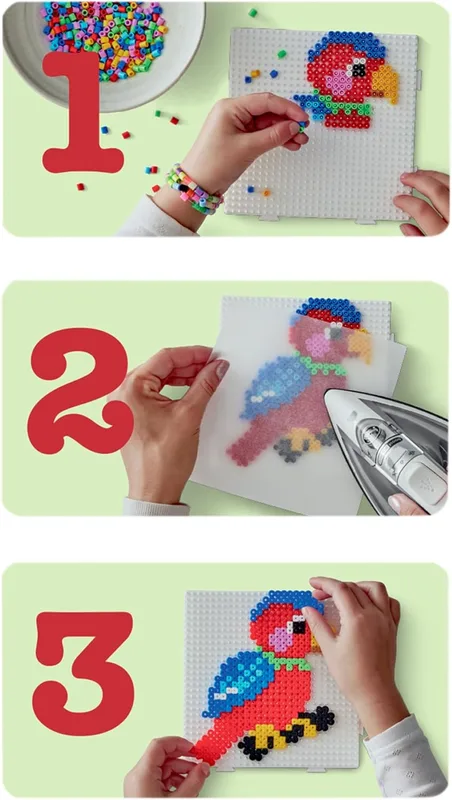 הניחו את נייר הגיהוץ על גבי החרוזים, גהצו (רק בהשגחת הורים) מעל נייר הגיהוץ בחום בינוני, בגיהוץ יבש ובאופן אחיד עד שהשכבה העליונה נמסה מעט.