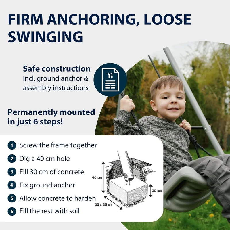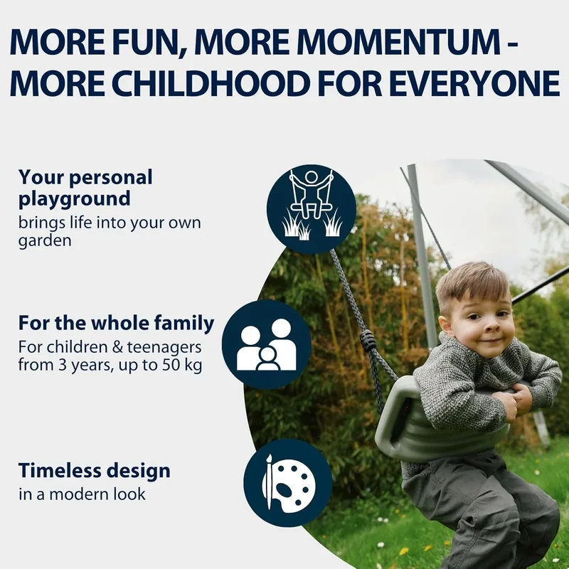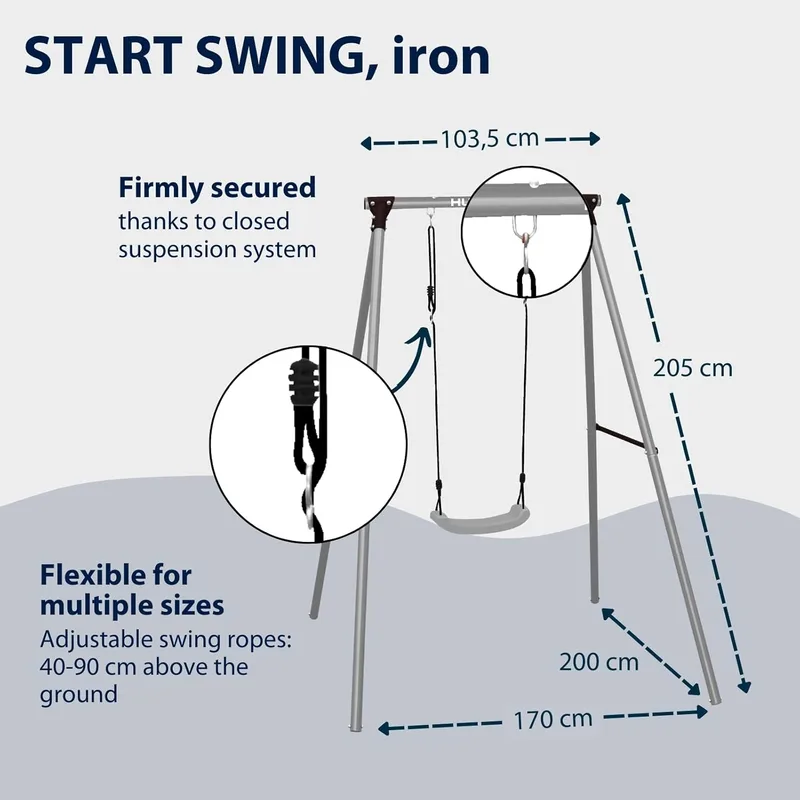 כולל מושב נדנדה מתכוונן לגובה 40–90 ס"מ להתאמה לפי גיל וגובה הילד.