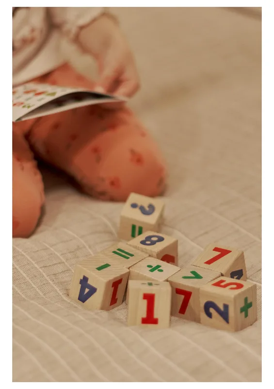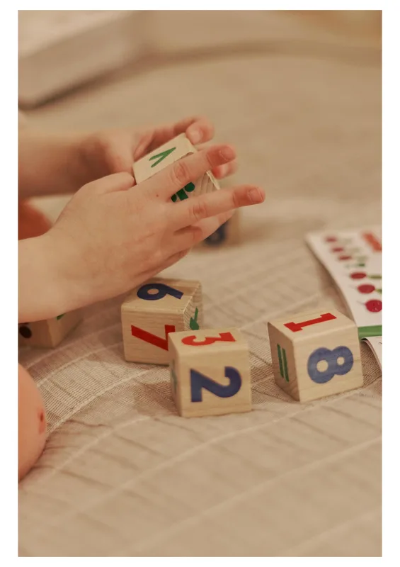 • 9 קוביות עץ עם מספרים וסימנים מתמטיים