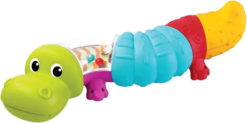 התינוק יושב על הרצפה ומשחק בכפתורים, אורות, צלילים וצעצוע התנין המצורף.