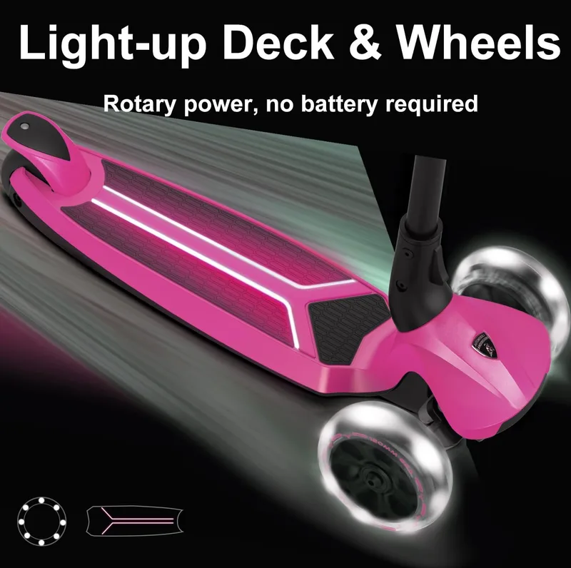 גלגלים קדמיים מוארים ומשטח עמידה עם תאורת LED שפועלים ללא סוללות – האור נדלק בזמן הרכיבה.
