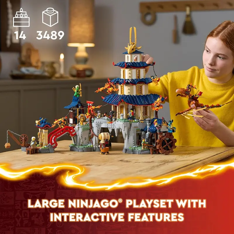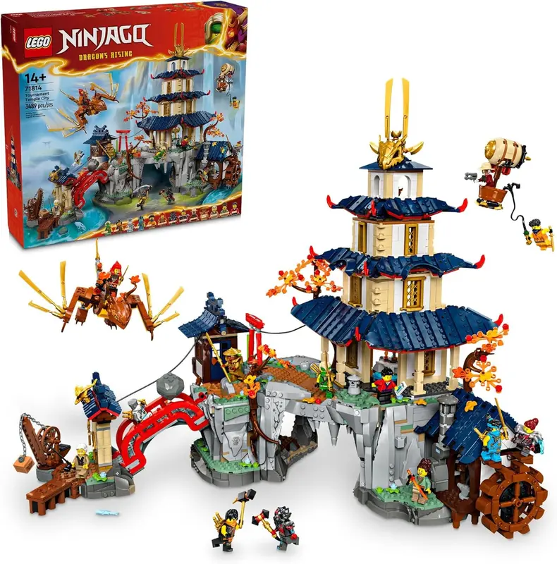 ערכת LEGO® NINJAGO "טורניר עיר מקדש" (71814) היא אחד הדגמים המרהיבים והמרגשים ביותר בסדרת Dragons Rising. עם עיצוב עוצר נשימה של מקדש עתיק הבנוי על צוק סלעי מוקף מים, זו חוויית בנייה מרתקת שמשלבת אקשן, מסתורין, רוח לחימה והמון קסם נינג’ה.
