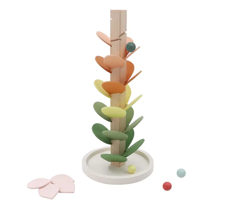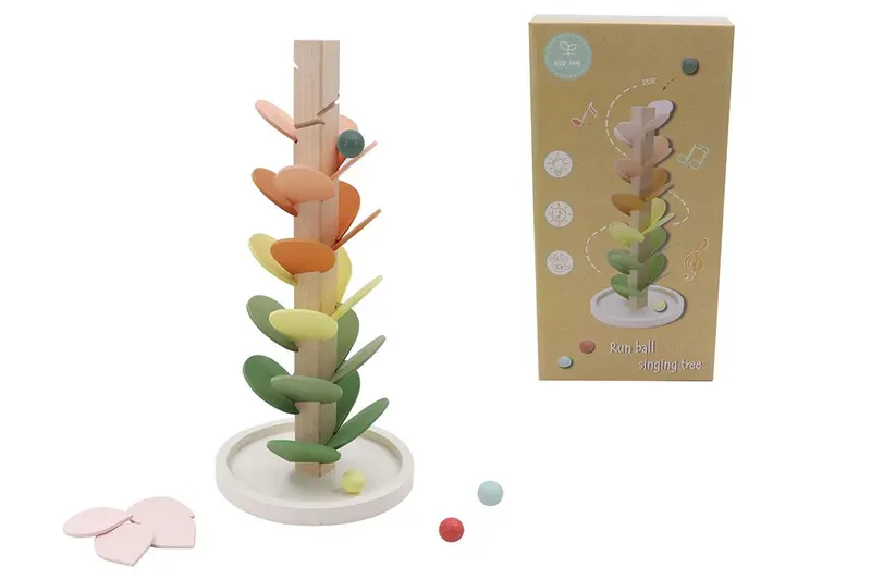 משחק עץ מקסים, עליכם להפיל את כדורי העץ הצבעוניים על עלי הספירלה ותוכלו לשמוע את הצליל שלהם בעודם מתגלגלים מטה.