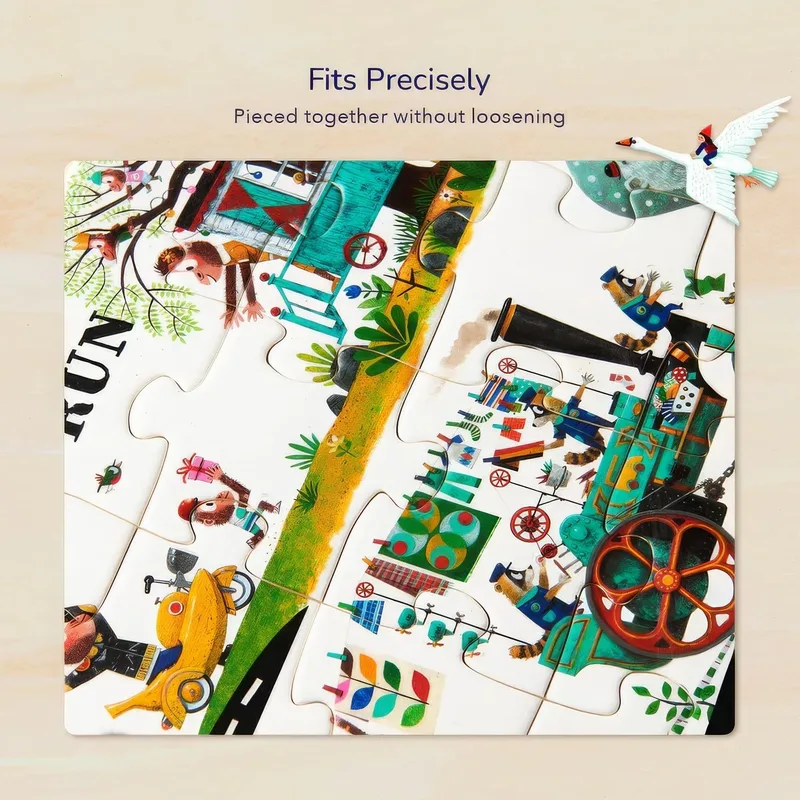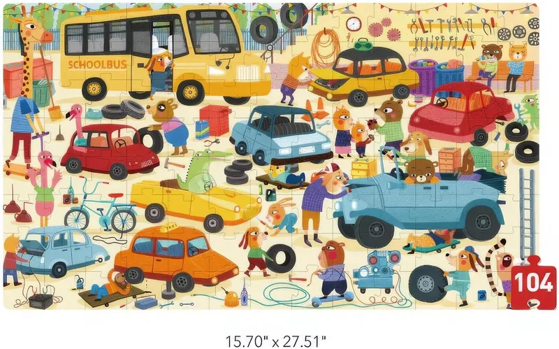 פאזל איכותי בן 104 חלקים, עם איורים מתוקים וצבעוניים.