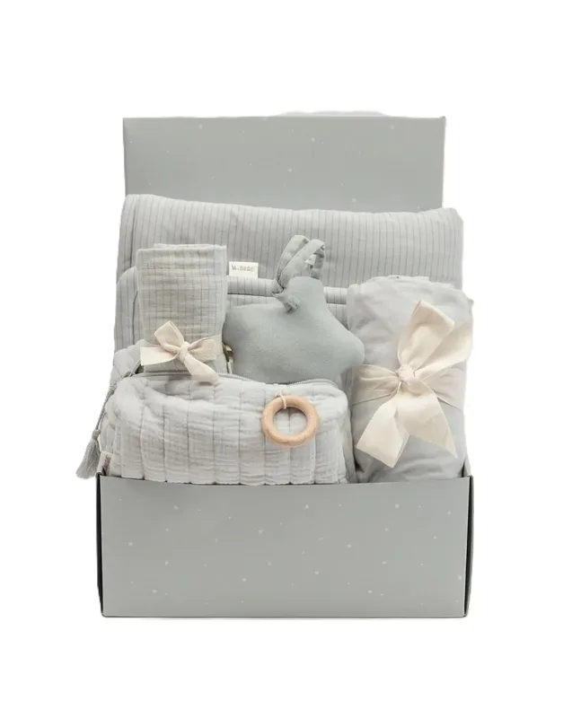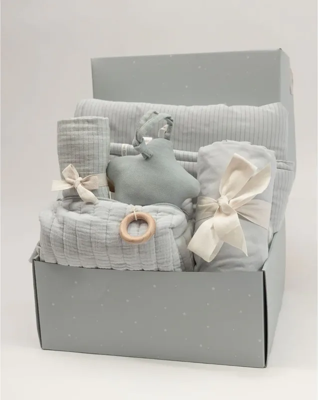 המארז משלב פריטי טקסטיל ואביזרים שימושיים שמלווים את שגרת היום־יום של התינוק – שינה, טיול והרגעה.