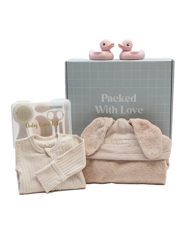 המארז מרכז פריטים יומיומיים חיוניים לשגרת ניו־בורן – לבוש נעים, מוצרי טיפוח ואביזרים לאמבטיה.