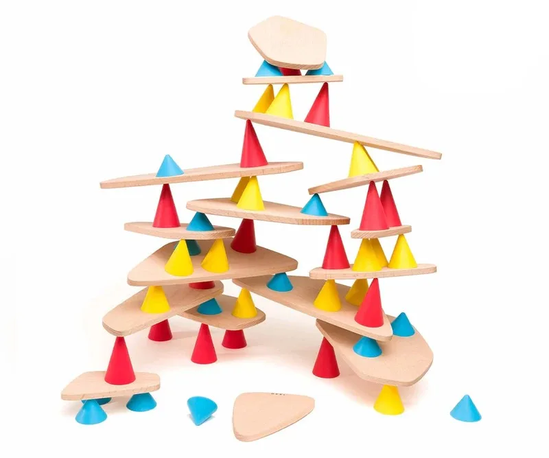 באמצעות שילוב ייחודי של קונוסים מסיליקון רך ולוחות עץ שטוחים בגדלים שונים, הילדים בונים מגדלים, דמויות ומבנים – תוך שמירה על שיווי משקל.