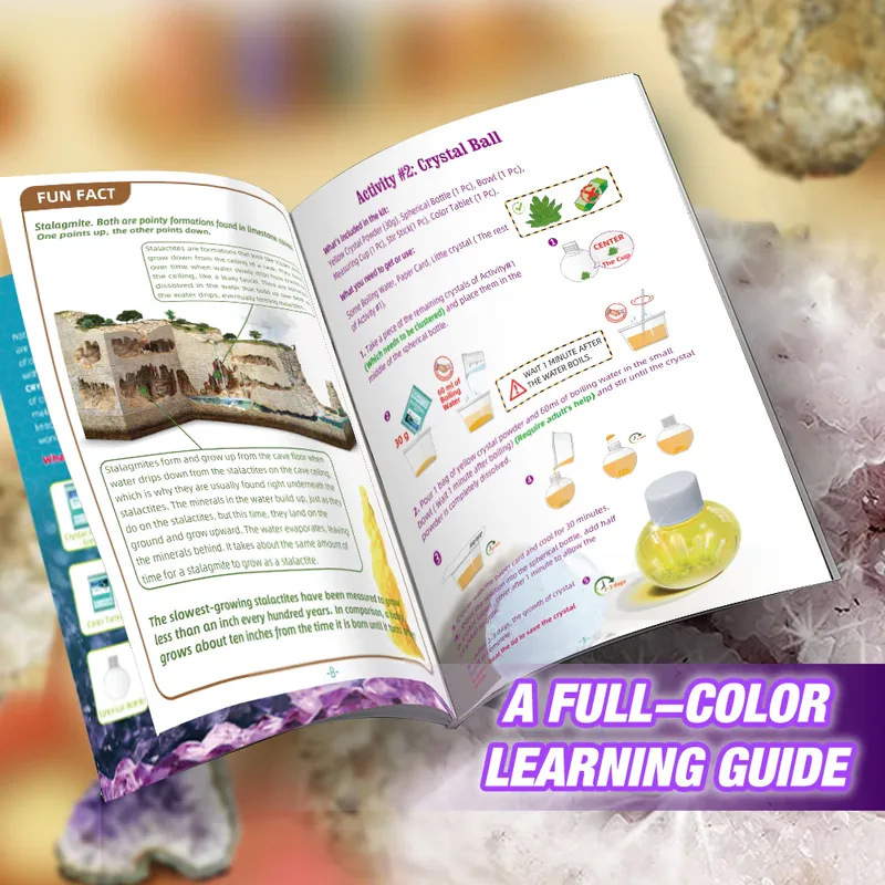 ערכת יצירה וניסוי מדעי שבה הילדים שוברים, חוקרים וחושפים קריסטלים וגיאודות מרהיבים.