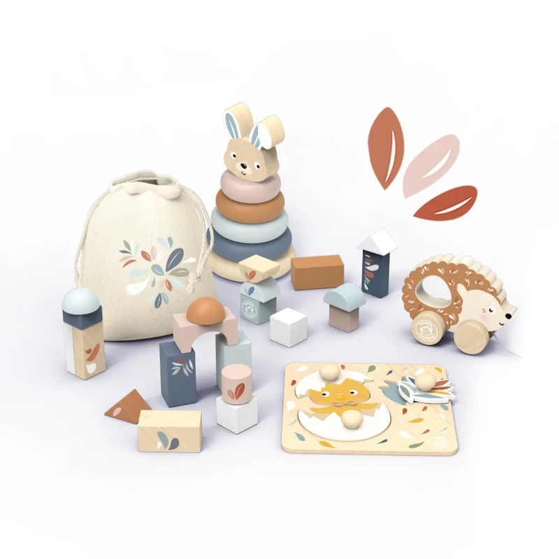 סט מושלם של צעצועים ראשונים: כולל בלוקים מעץ עם שקית בד, משחק ארנב מתוק, פאזל אפרוחים צבעוני וקיפוד נגרר.