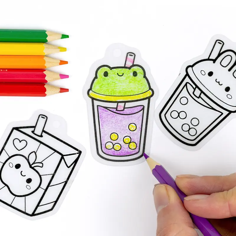 הילדים בוחרים את הדמויות והעיצובים מתוך דפי השרינקיס המצורפים, צובעים אותם ומכניסים לתנור הביתי.