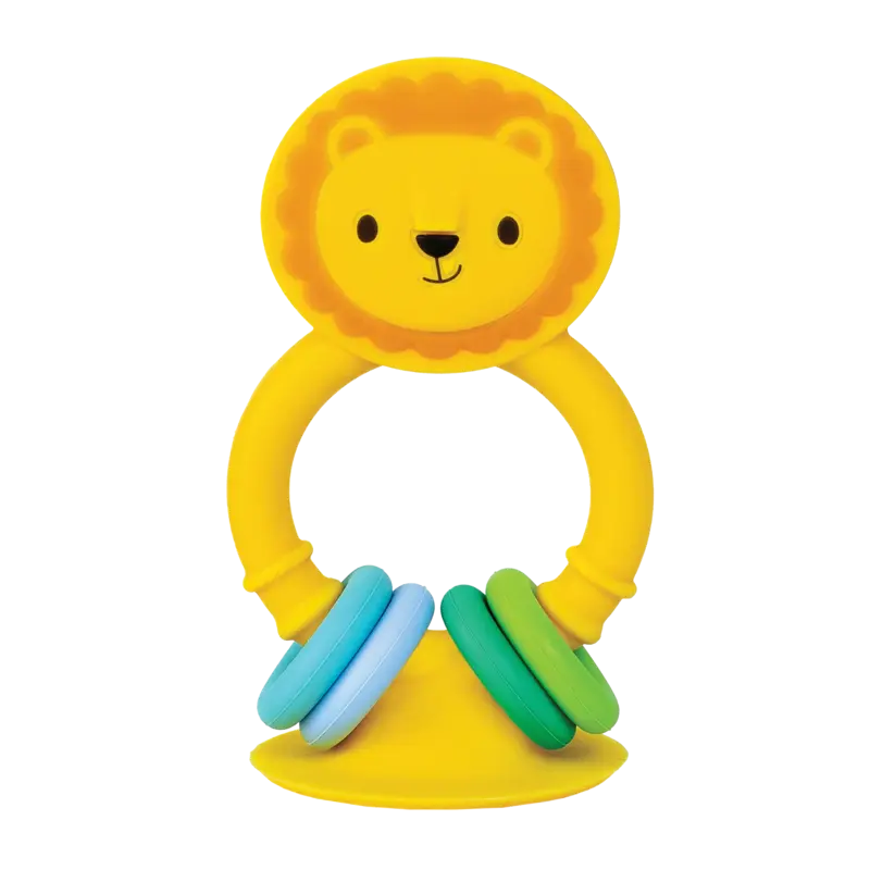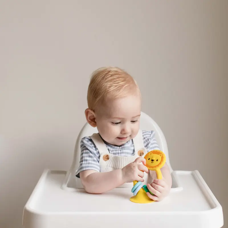 מצמידים את האריה בעזרת כוס היניקה למשטח חלק, ומאפשרים לתינוק למשוך, לדחוף, לגעת ולנשוך.