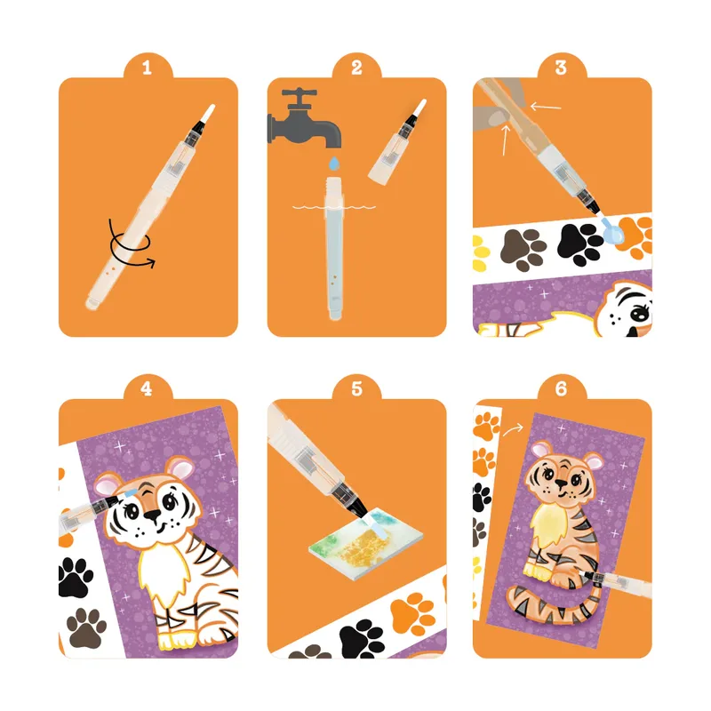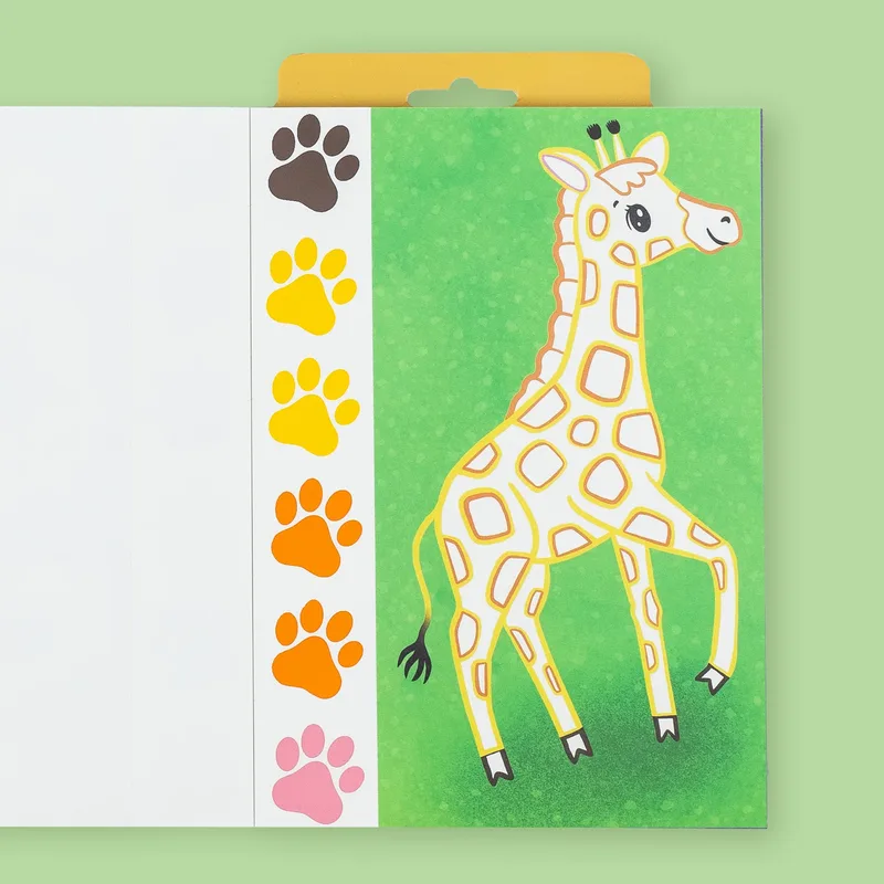 כל אחד מ־16 הדפים כולל איור ייחודי של חיות פרא, ו־6 פיגמנטים של צבעי מים שמופעלים בעזרת מכחול מים.