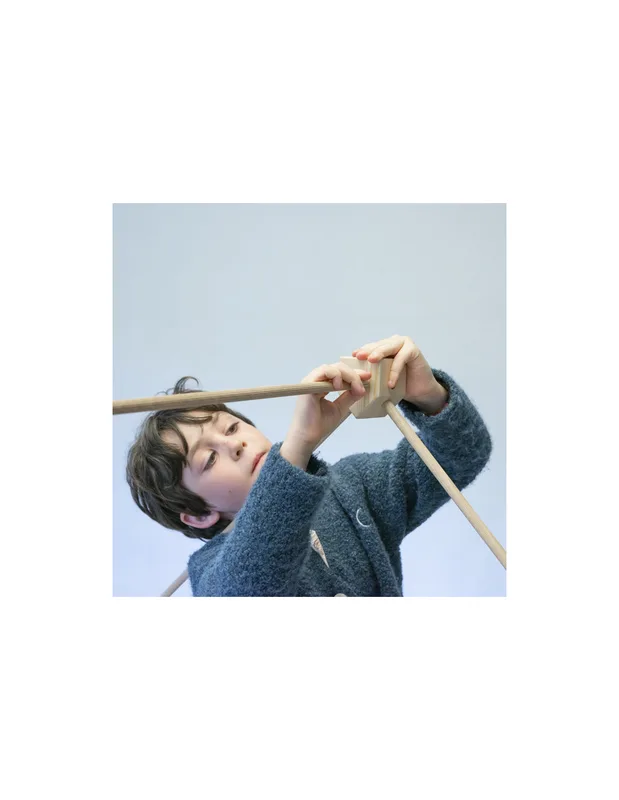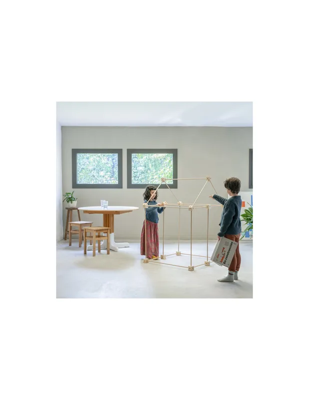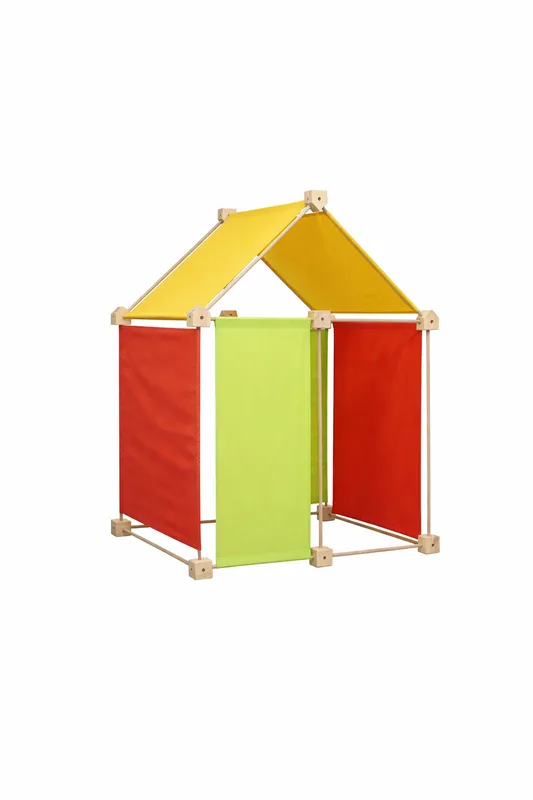 המקלות נכנסים לחורי הקוביות ויוצרים שלד יציב, והבדים מושחלים עליהם ליצירת קירות וגג מתוחים ומוגדרים.