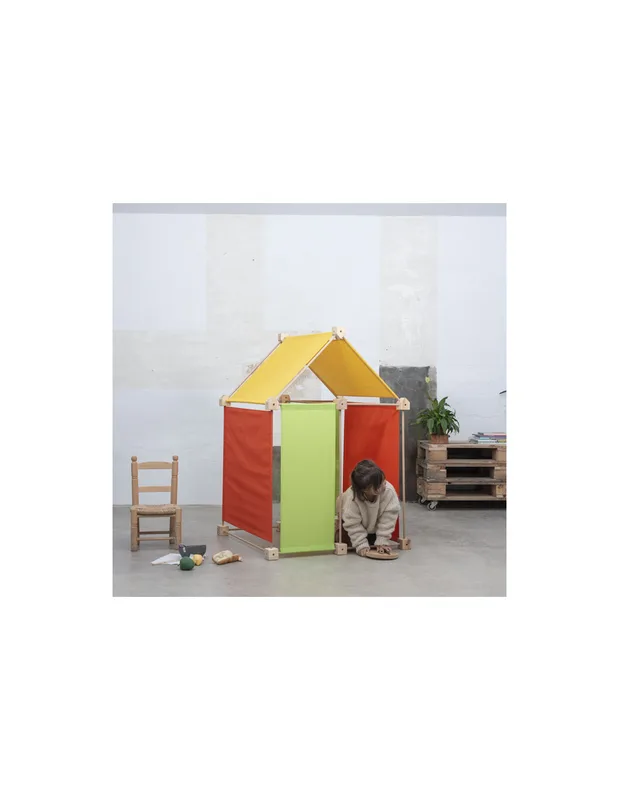 Trigonos Kernel Frukto משלב שלד עץ טבעי עם בדים בגווני כתום, צהוב ופיסטוק – ויוצר בית משחק שמרגיש כמו שוק קיץ צבעוני, כמו קרקס קטן בחצר או כמו חנות פירות דמיונית מלאה חיים.