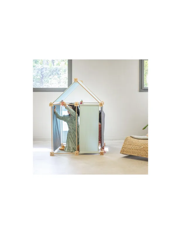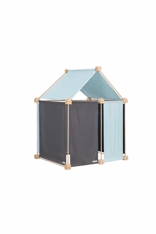 Trigonos Kernel Hejmo משלב שלד עץ טבעי עם בדים בגווני טורקיז בהיר ואפור מכותנה אורגנית – ויוצר בית משחק מודרני, רגוע ומדויק. כזה שמשתלב יפה בחלל, ומרגיש כמו פינה פרטית לילדים בתוך הבית.