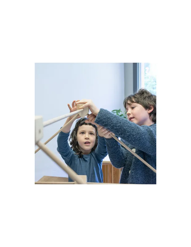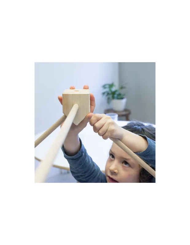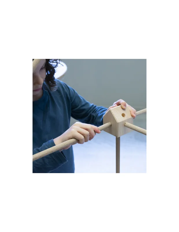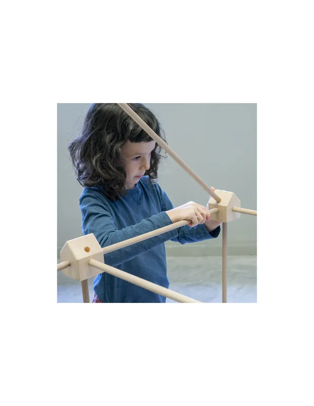 המקלות נכנסים לחורי הקוביות ויוצרים שלד יציב, והבדים מושחלים על המקלות כך שהם מתוחים ויוצרים חללים מוגדרים וברורים.