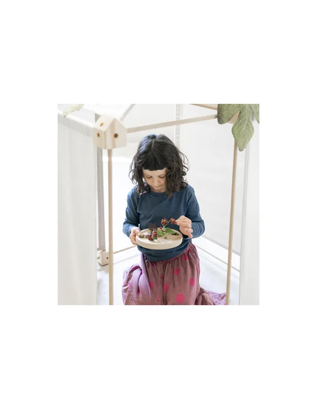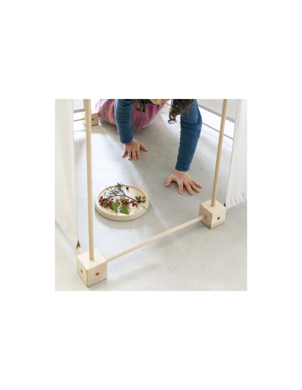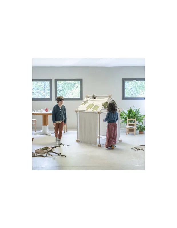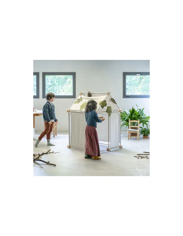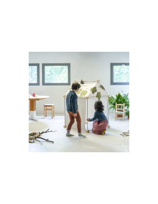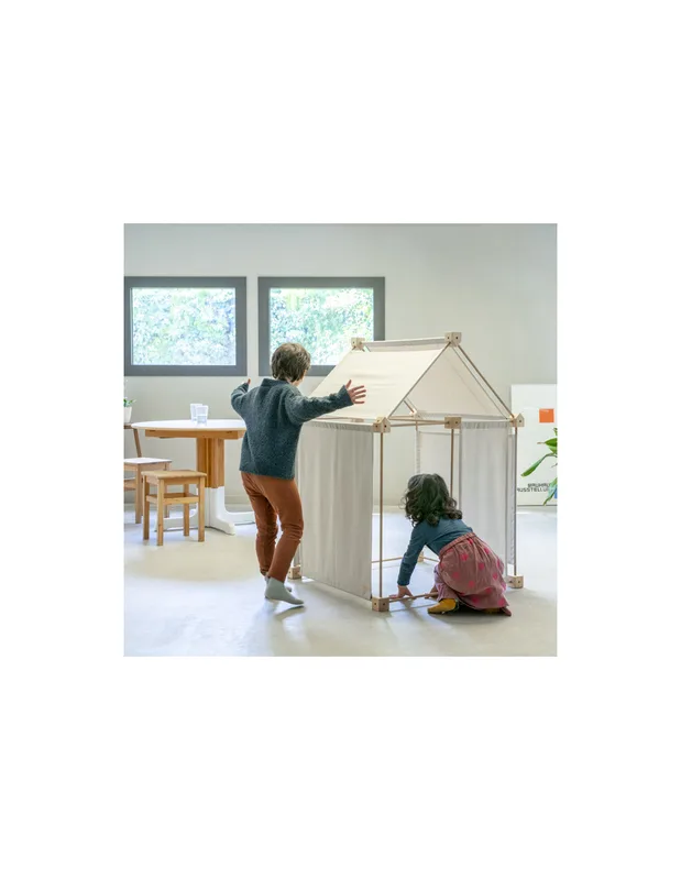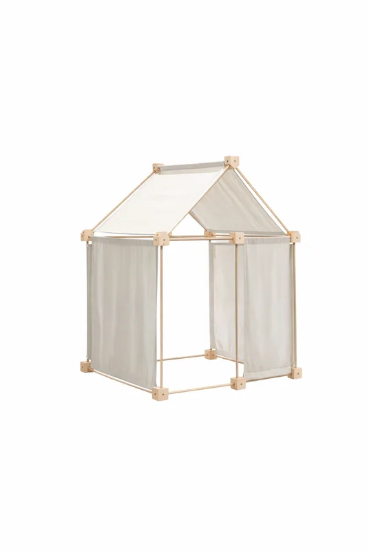 Trigonos Kernel Kreema הוא משחק בנייה מעץ עם בדים מכותנה אורגנית בגוון טבעי (קרימה), שמאפשר לילדים לבנות בית עץ שלם – כזה שאפשר להיכנס אליו – ואז לפרק ולהתחיל מחדש.