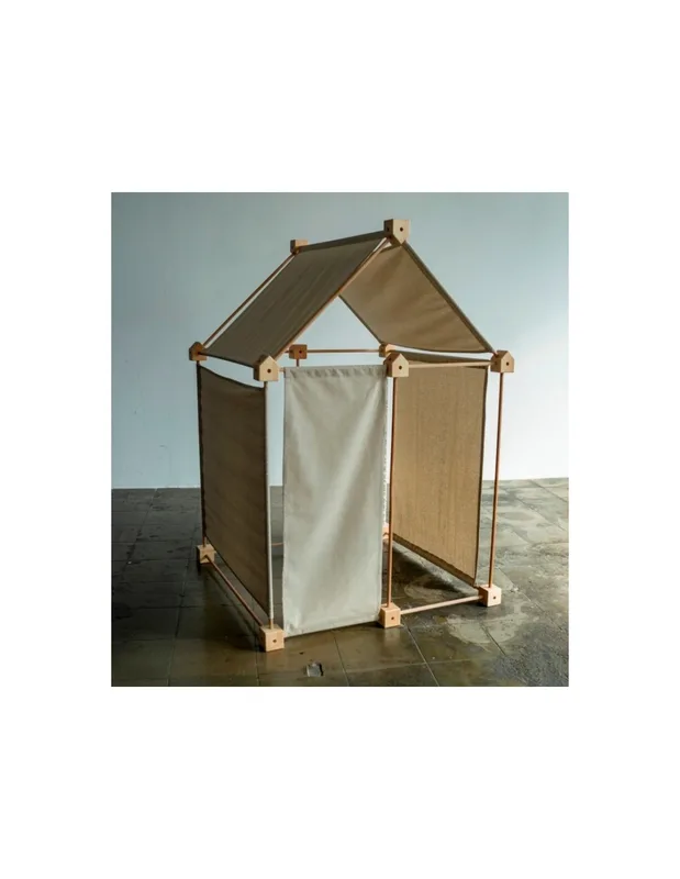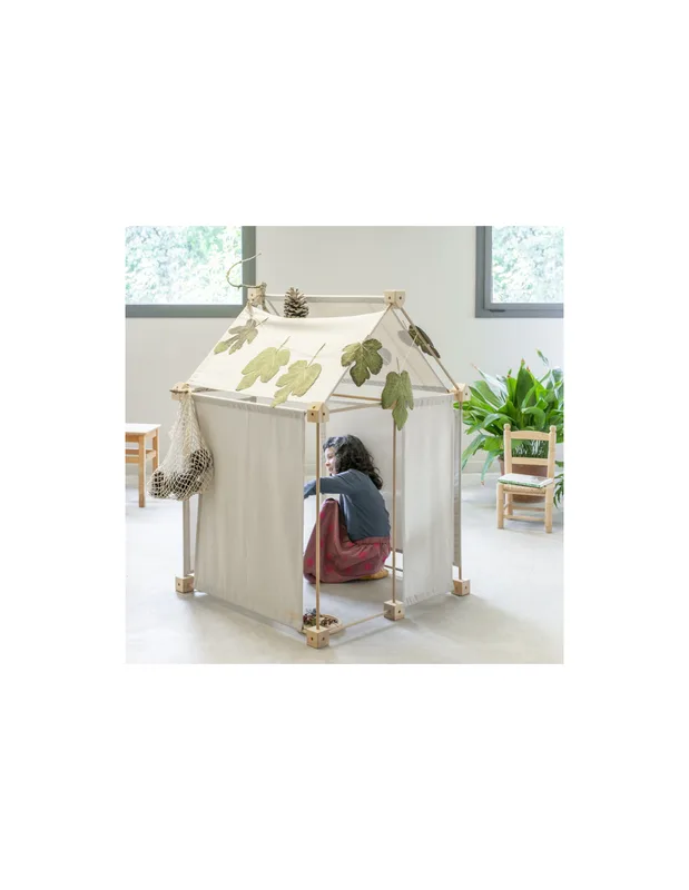 מערכת החיבור פשוטה: המקלות נכנסים לחורי הקוביות ליצירת מבנה יציב, והבדים מושחלים על המקלות ליצירת קירות וגג מתוחים וברורים.