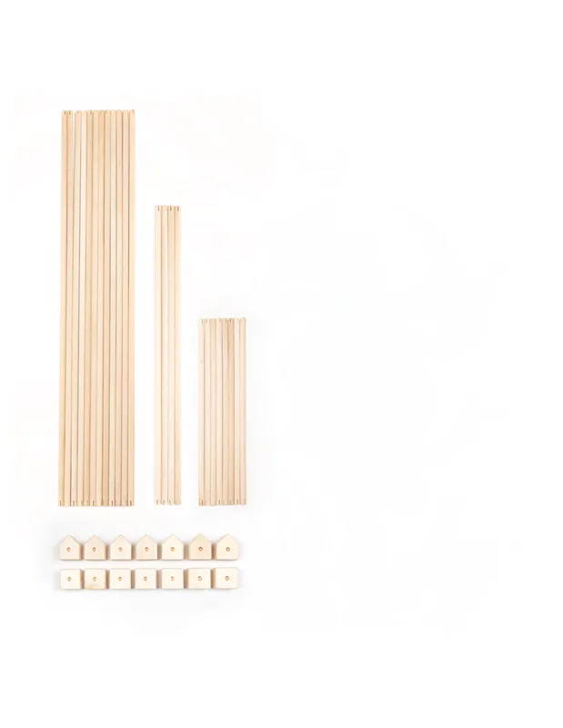 כולל 44 חלקים – מקלות, קוביות ובדים – ליצירת מבני משחק גדולים ומוגדרים היטב.