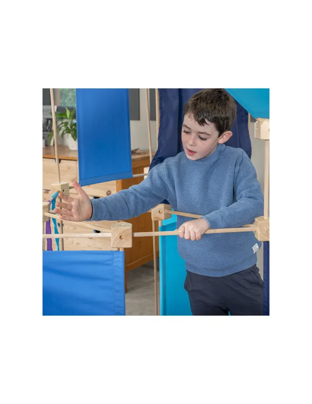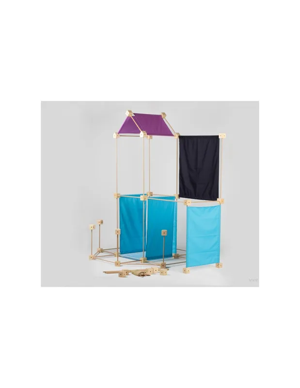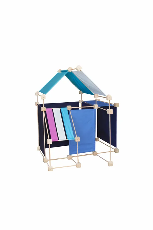משחק בנייה מעץ הכולל 150 חלקים – מקלות, בלוקים ובדים בגווני כחול שונים.