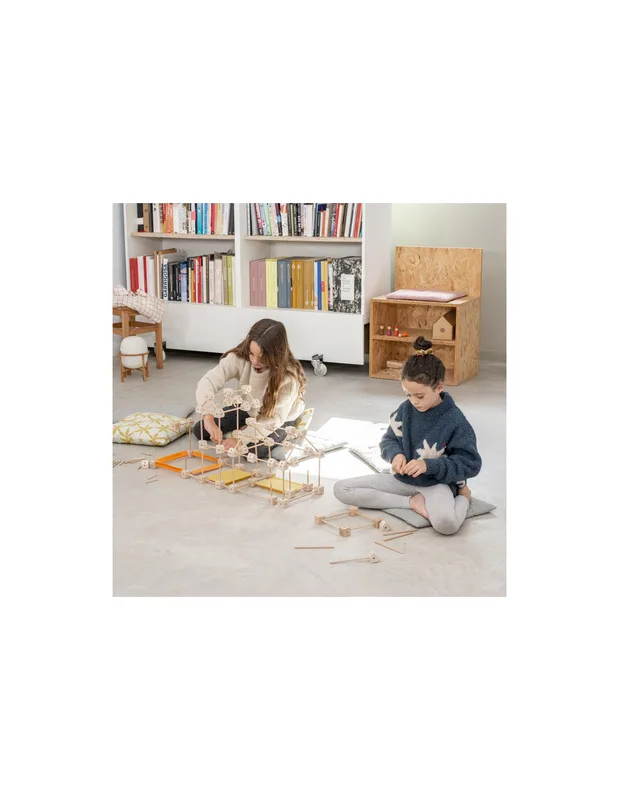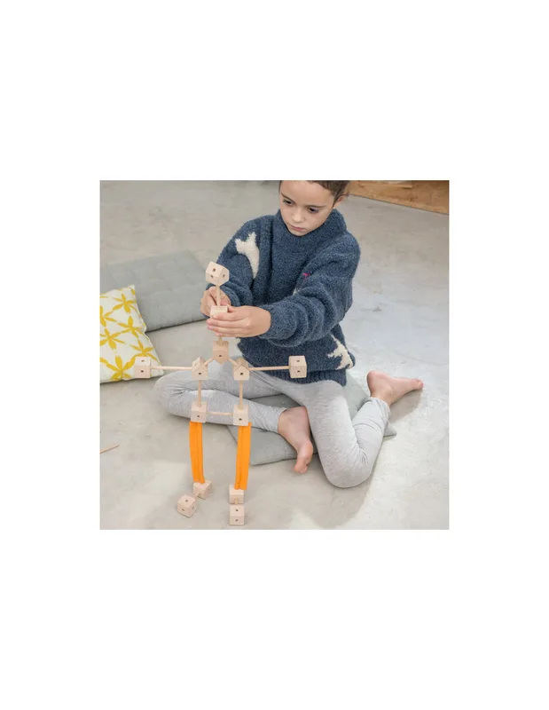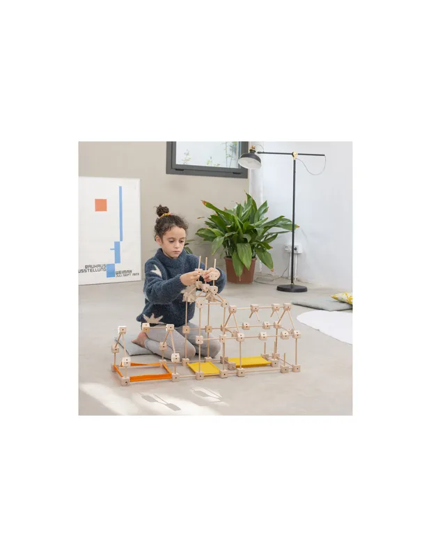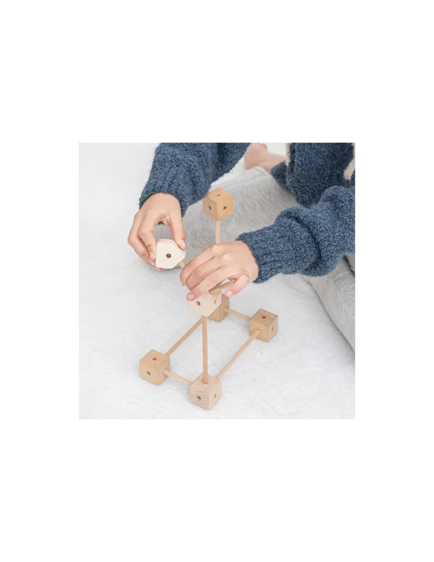 משחק בנייה מעץ המשלב מקלות, בלוקים ובדים, עם מערכת חיבורים פשוטה וגמישה.