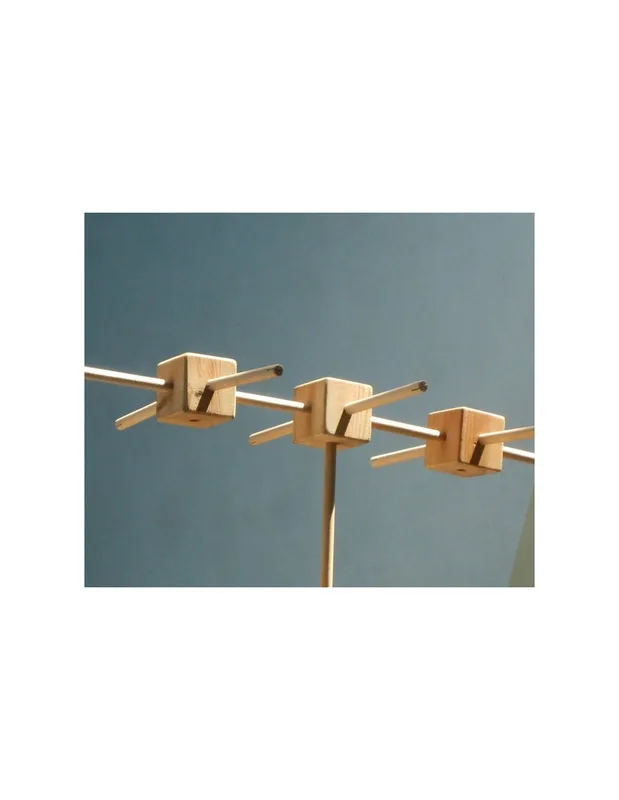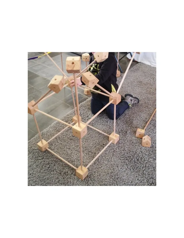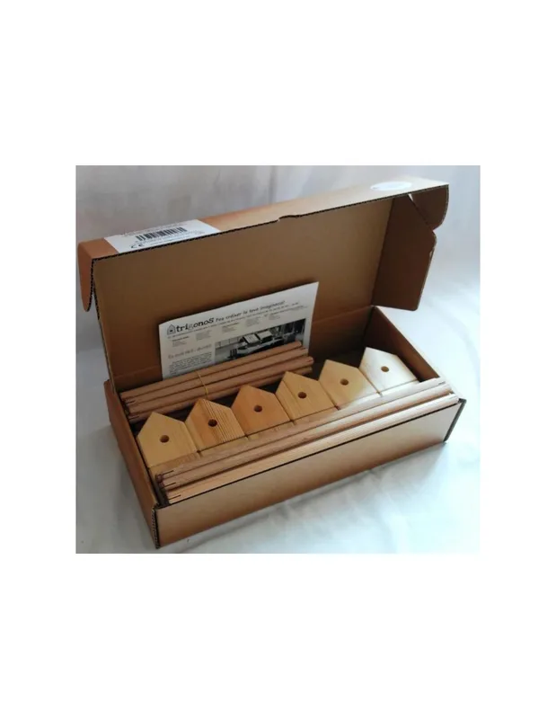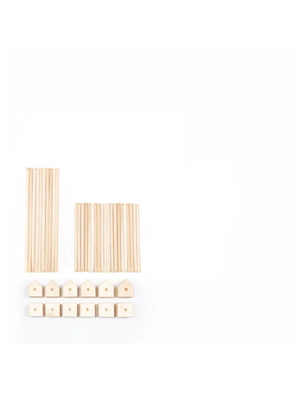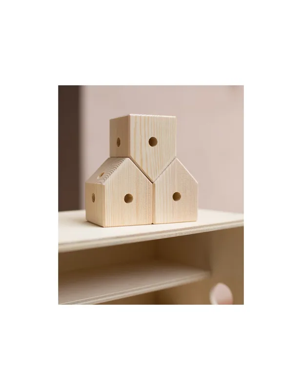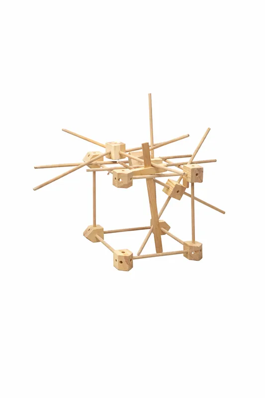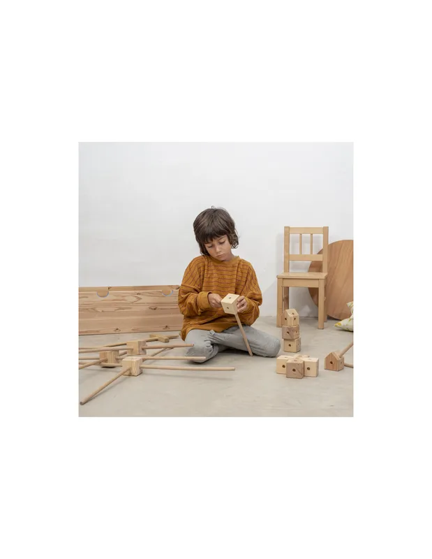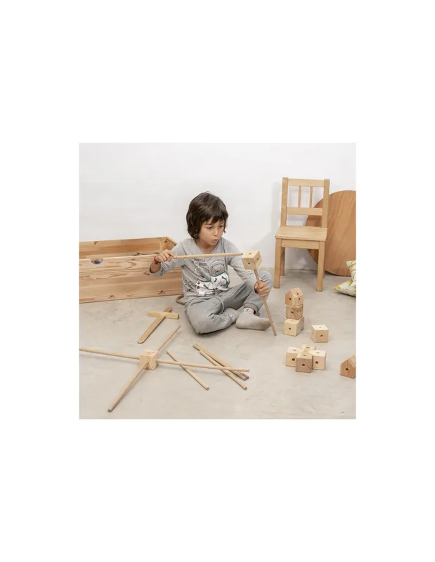 מארז התחלתי של Trigonos כולל 42 חלקי עץ – קוביות ומקלות – לבנייה חופשית ללא הוראות קבועות.